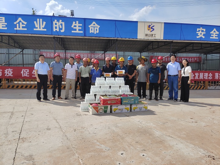 7月21上午,業(yè)主單位黃山市城投集團(tuán)黨委書記、董事長陳杰、總裁黃世穩(wěn)等一行分組帶隊(duì)到我公司承建的黃山市危險(xiǎn)(含醫(yī)療)廢物集中處置中心易地重建工程、黃山市南部城鎮(zhèn)群水務(wù)調(diào)度中心項(xiàng)目、黃山生豬定點(diǎn)屠宰加工及配套設(shè)施項(xiàng)目及配套冷鏈項(xiàng)目施工現(xiàn)場送來了人丹、十滴水、礦泉水、西瓜等防暑降溫用品,并向奮戰(zhàn)在一線的施工人員及項(xiàng)目部管理人員表示了親切的慰問和感謝,對一線人員頭頂烈日不畏酷暑的精神給予了贊揚(yáng)。