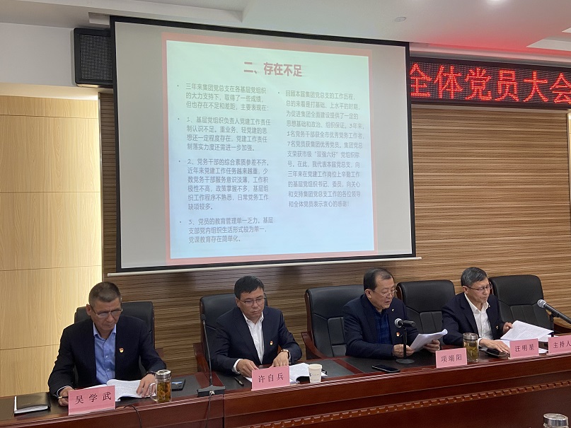 在莊嚴肅穆的國歌聲中,集團公司黨總支換屆選舉拉開了序幕。按照既定會議流程,集團黨支部書記項端陽首先在圍繞政治建設、思想建設、組織建設、作風建設、廉政建設和黨建深化與創新等方面系統地回顧了近幾年來的工作,分析了黨建工作面臨的形勢與存在的問題。同時對下一屆集團黨總支工作提出了五點建議。經過全體黨員認真審議,通過了總支書記項端陽同志所做的報告。